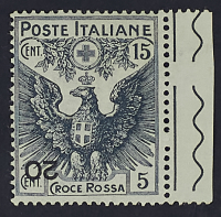 1916 - Croce Rossa 20 + 15 c. soprastampa capovolta bordo di foglio a destra - Cert. Bolaffi