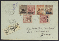 1922/23 - Prima emissione 20 c. e 40 c. + seconda emissione 10 c. con valori complementari su raccomandata del 26 gennaio 1924 da Bologna per Roma - Rara - Cert. Raybaudi - Firma Caffaz
