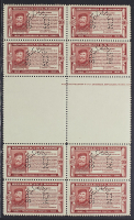 1932 - Garibaldi - Saggio 20 c. carminio con perforazione "SPECIMEN" blocco di otto esemplari con due coppie verticali con interspazio di gruppo (piega orizzontale) - Raro