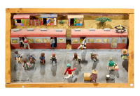three-dimensional mixed media on panel (wood, cardboard, sand)