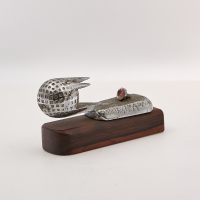 chromed metal, on wooden base.