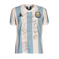 On the front: flocked technical sponsor logo and sewn-on Argentina national football team crest. Features the signatures of national team players including Maradona, Diaz, Passarella Olguin, Bertoni and a