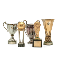 Cup Winners' Cup, UEFA Cup, European Cup, and Intercontinental Cup used for photo shoots for Hurrà Juventus with Tacconi and Roberto Baggio and a reproduction of the 1994 World Cup trophy. Two gold plates joined together.