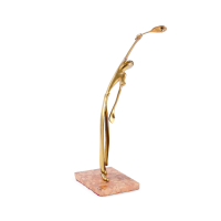 Dark patina copper, on a square base with a pencil sharpener in plastic and metal, depicting four athletes from different sports disciplines: shooting, swimming, discus throw and shot put.