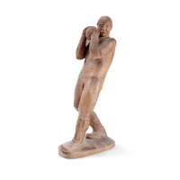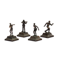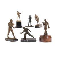 Bronze, bronze with dark patina and metal, on marble and wooden bases, depicting bowlers, boxers and a wrestler.