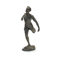One in bronze-plated antimony, signed Lemoyne, on a green marble base; the other, metal, depicting a relay runner, on a wooden base, bearing the German inscription Quer Durch Allschwil II Preis Kat C 1936 - T. V. Neu - Allschwil.