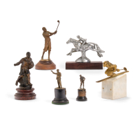 Bronze, antimony and metal on wooden bases and one marble base, depicting a golfer, a skier, a rugby player and other sportsmen.