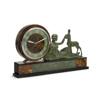 Marble, bronze and metal with circular case depicting a lying girl caressing fawns, signed Willemon at the back. Complete with charging key.