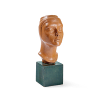 Cold-painted terracotta, signed lower on the reverse, on wooden base.