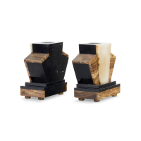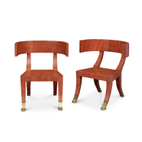 Varnished wood, reinterpretation of the Greek Klismos model with two brass feral feet adorning the two front legs of the armchair.