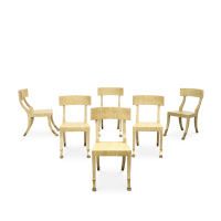 Varnished wood, reinterpretation of the Greek Klismos model with two brass feral feet adorning the two front legs of the armchair.