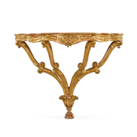 Carved gilt-wood, shaped top, double spiral legs with plant motifs, marble top.