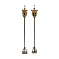 Gilt-metal and glass, tall smooth ebonised wooden shaft, on wrought iron bases.