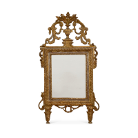 Carved gilt-wood, with phytomorphic decorations and leafy scrolls, tulip bulb-shaped feet, and a cymatium topped with a vase of flowers.
