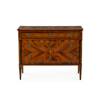 Carob wood veneer, with filigree inlays, geometric motifs and a rosette on the top and a cherub within a reserve on the front, with three drawers, brass handles and locks.