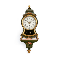 Green lacquered wooden case with painted floral decoration, complete with hood and bracket.