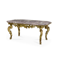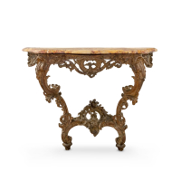 Carved wood, on two legs richly decorated with plant motifs and rocailles, shaped marble top.