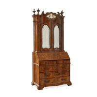The shaped fallfront has drawers and compartments and a secret compartment inside; the upper part consists of double doors and modern partially engraved mirrors,