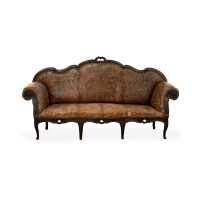 Shaped wood, operated leather with plant motifs upholstering, with curled armrests and scalloped legs.