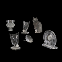 Glass and frosted crystal, including a table clock, two paperweights, a flower, a small vase and a seated cat.