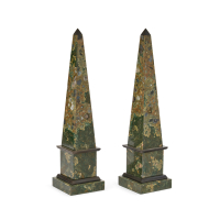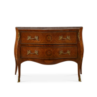 Veneered in various essences with fillets inlays, circular reserves centred with eight-pointed stars on the front and sides, ormolu handles and applications with leaf-shaped scrolls, with two drawers, shaped and slightly rounded.