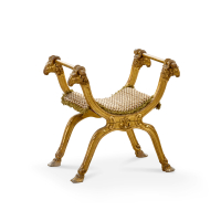 Carved and partially gilt-wood, curved legs with hoof-shaped feet, the armrests joined by crossbars with ram's head-shaped finials, upholstered seat.