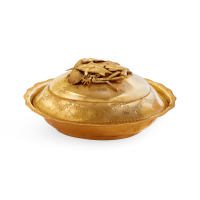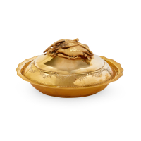 Oval with shaped edge and engraved rim, the lid topped with a hunting trophy.