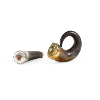 Horn, one with silver and glass paste terminals and one with a brass terminal, the brass one bearing the date 1840 engraved on the rim of the terminal.