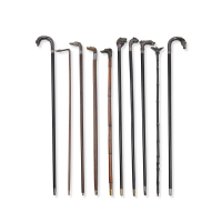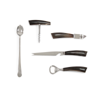 Comprising three pieces of cutlery and two bottle openers with horn handles, within original leather, silk and velvet case.