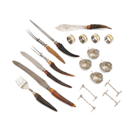 Silver-plated metal, horn and bone, including six cutlery, a knife sharpener, four salt cellars with teaspoons, four cutlery holders and four napkin rings. Within wooden, velvet, and silk fitted case.