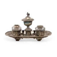 Rectangular base embossed on four animal feet, two side holders in openwork silver with glass liners, four pen holders and a central one with lid, topped by a rooster.