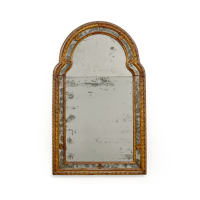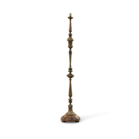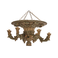 Carved and partially gilt-wood with acanthus leaf and leaf volutes decoration, with seven lights on six scrolled arms.