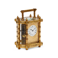 Gilt brass case finely engraved with leaf motifs, with glass panels allowing the movement to be viewed.