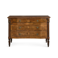 Walnut with boxwood inlaid vents, scrolled front, with three drawers with metal handles, vertical corner posts with flutes and leaf friezes.