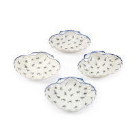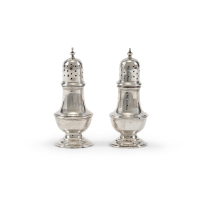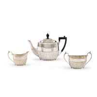 Assembled set including a teapot with geometric handle and ebonised wooden knob, oval with large dimples, England, 20th Century, with a similar sugar bowl and milk jug by Mappin & Webb, London, 20th Century.