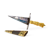 Metal and gilt-metal, fabric sheath with gilt-metal applications, partially enamelled blade, finely chiselled hilt with figures of saints. In red leather and velvet fitted case, inside tag inscribed “Dagger belonging to the Patriot Attilio Bandiera 1810-1844”.