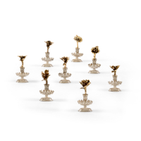 Shaped like centrepieces surmounted by flowers. Inside a velvet and silk case bearing a paper label from the Blua jewellery shop in Turin.