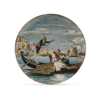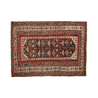 Polychrome decoration with geometric motifs on sand and burgundy ground.