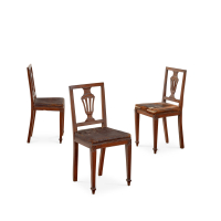 Carved wood, openwork backrest with lyre motif, leather upholstering.