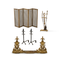 Metal and gilt-metal, including andirons, spark arrestors, and a fireplace set.