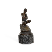 Brown and dark patina bronze, signed on the reverse, on circular black marble base.