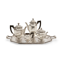 Including an octagonal teapot, coffee pot, sugar bowl and milk jug with geometric handles in ebonised wood and spouts with lambrequins, and an octagonal tray en suite.