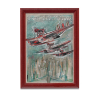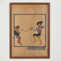 Watercolor, tempera, and charcoal on paper, titled, bearing illegible signature lower right recto, depicting rowers, fencers, and football players.