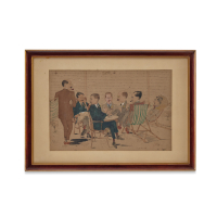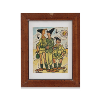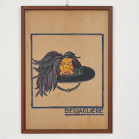 Watercolor, tempera, and charcoal on paper, titled and illegible signature lower right recto. Depicting a Bersagliere, a consul, a deputy, a Podestà, and a fighter.