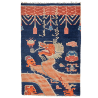 Blue ground with polychrome decoration of dragon, sacred objects, festoons and inscriptions.
