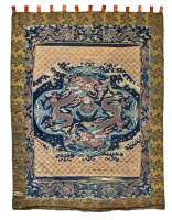 Silk with polychrome embroidery, in the centre a quadrilobate reserve with four dragons flying amidst clouds, darts, waves and mountain peaks, the lower and upper areas with stylised waves, the scene enclosed within a frame