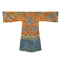 Silk embroidered with multicolored and gold threads, orange ground, both with a dragon in flight chasing the Pearl amidst clouds and darts, two sides with stylized waves, one with blue ground and the character shou ("longevity") repeated seven times.
