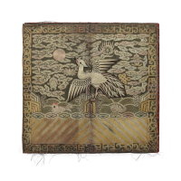 Silk embroidered with polychrome threads, featuring a goose perched on a rock emerging from sea waves, its beak pointing to the sun, intended for a civil official.