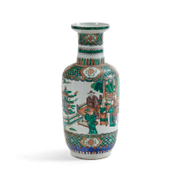 Porcelain with polychrome enamel decoration, the body with a landscape scene crowded with soldiers and deities, some riding mythological animals, the areas towards the base, shoulder and neck with bands of geometric motifs and stylised leaves and flowers.