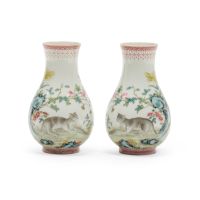 Porcelain painted with polychrome enamels with a decoration of figures in a landscape, on one side the three Fulushou deities with attendants, handles shaped as a pair of Buddhist lions facing each other.